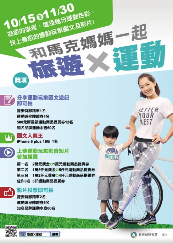 二、為讓更多國人了解旅遊和運動結合之意涵,達到休閒更兼顧健康的目標,特舉辦旨揭活動,其活動徵件時間自103年10月15日至103年11月30日止,上傳相關圖文及影片運動遊記,就有機會獲得獎金、iphone6 Plus、捷安特腳踏車及運動商品提貨券等大獎。